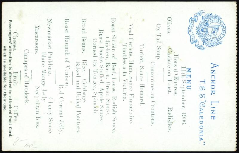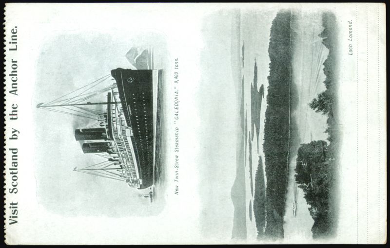 Cards are separated Menu for the Anchor Line's twin-screw steamship 'CALEDONIA' from December 1916. The menu features Olives, Ox Tail Soup, Consomme au Croutons, Radishes, Turbot, Sauce Homard, Veal Cutlets, Limes a la Victoria, Roast Sirloin of Beef, Horse Radish Sauce, Roast Chicken, Bread Sauce, Corned Ox Tongue, Spinach, Broad Beans, Rice, Cabbage, Baked and Boiled Potatoes, Roast Haunch of Venison, Red Currant Jelly, Newmarket Pudding, Rhubarb and Cherry Sauce, Macaroons, Blanc Mange, Jelly, Cream Ices. Also available are Cheese, Canapes of Haddock, Fruit, and Coffee. The card also features an illustration of the 'CALEDONIA' (9,400 tons) and a scenic view of Loch Lomond, promoting travel to Scotland. |