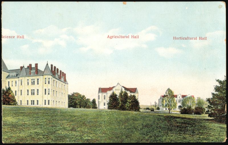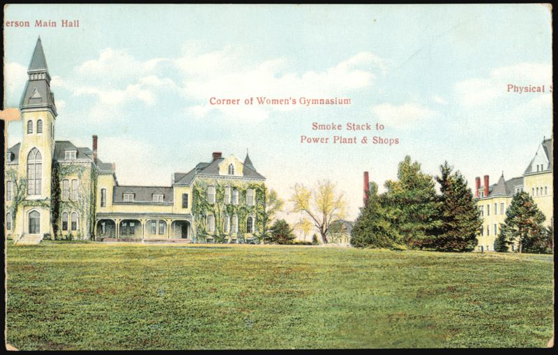 Cards are separated Features various campus buildings including Auditorium, Fairchild Library Bldg, Corner of Printing Bldg, Anderson Main Hall, Corner of Women's Gymnasium, Smoke Stack to Power Plant & Shops, Physical Science Hall, Agricultural Hall, and Horticultural Hall. |