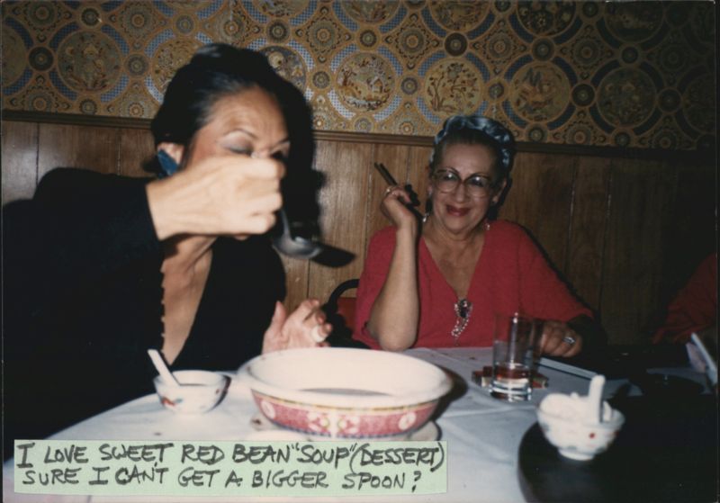 Two women are seated at a restaurant table. One woman is actively eating sweet red bean soup from a small bowl, while the other woman, wearing glasses, smiles and holds a cigarette. The background features patterned wallpaper.