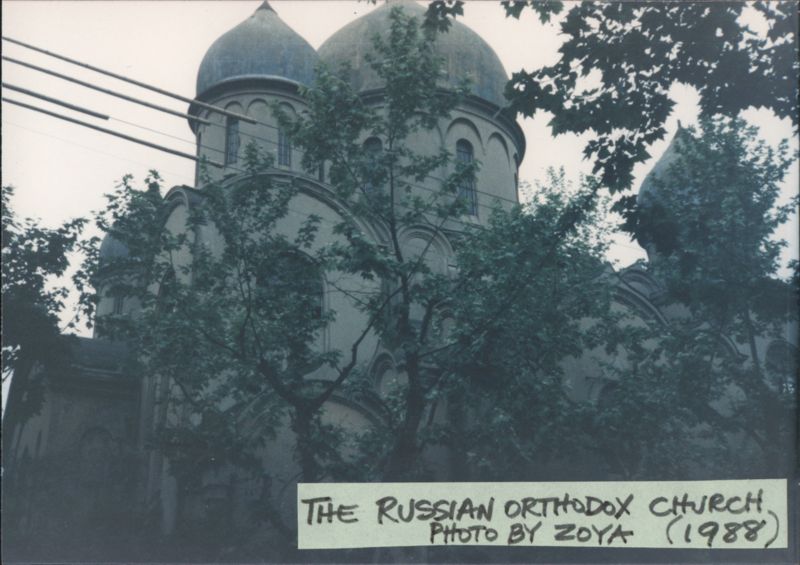 The Russian Orthodox Cathedral, still standing in 1988, is described as colorless, without its blue dome and golden crosses. It had been used as a warehouse for many years. Despite being shabby, it is still impressive and stately, though surrounded by new buildings with anticipation of its demolition.
