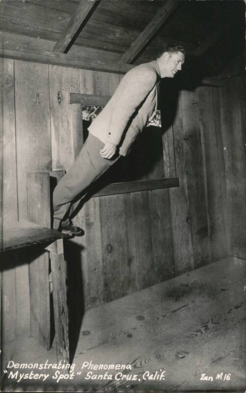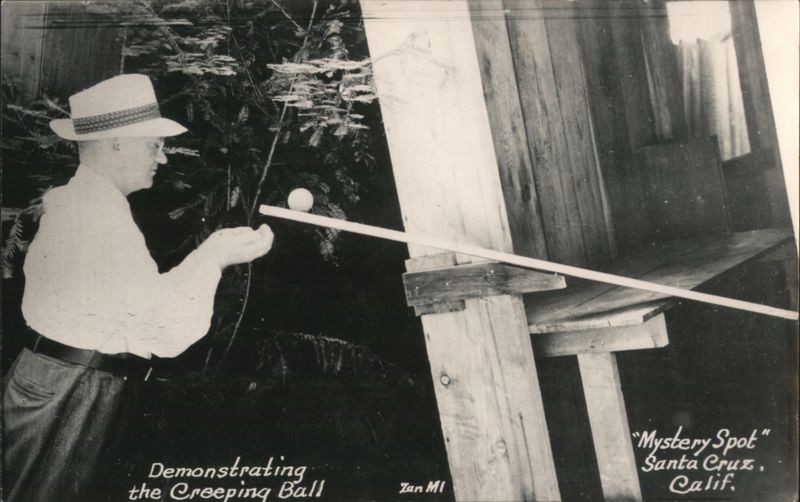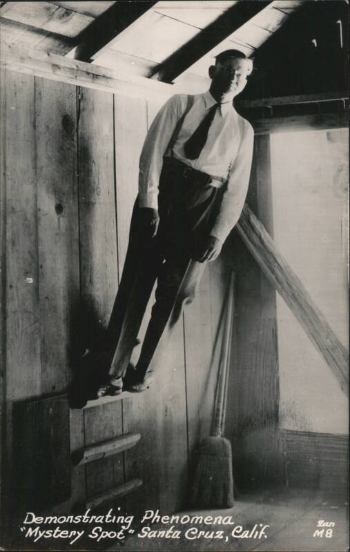 Demonstrating Phenomena "Mystery Spot" Santa Cruz, CA A man in a shirt and tie leans at an extreme angle against a wooden wall, appearing to defy gravity, at the Mystery Spot attraction. A broom also leans unusually. Man Demonstrating Phenomena at Mystery Spot North End "Mystery Spot" Santa Cruz, Calif. |