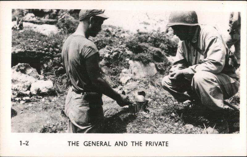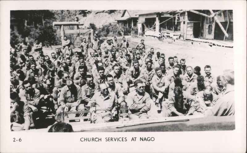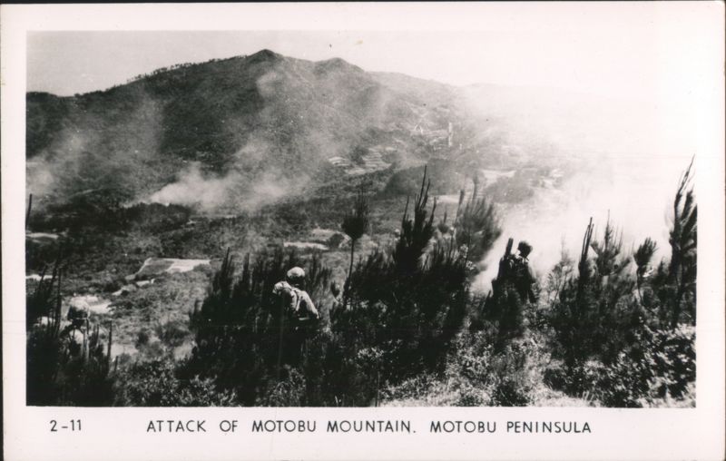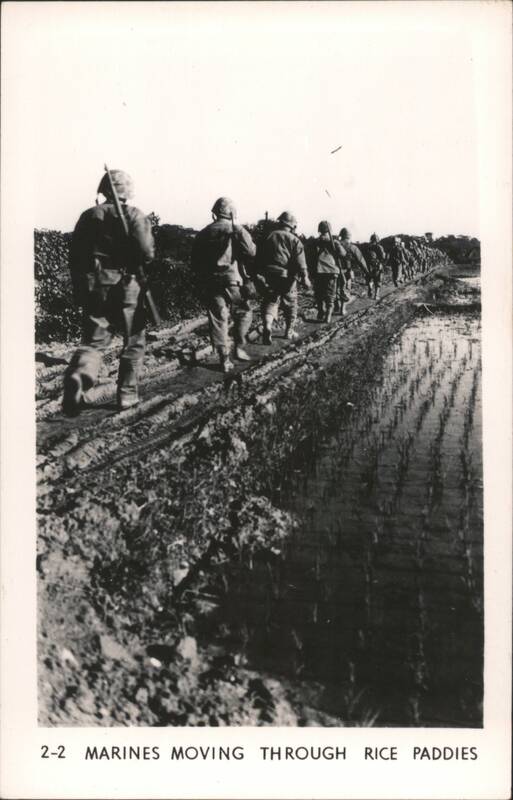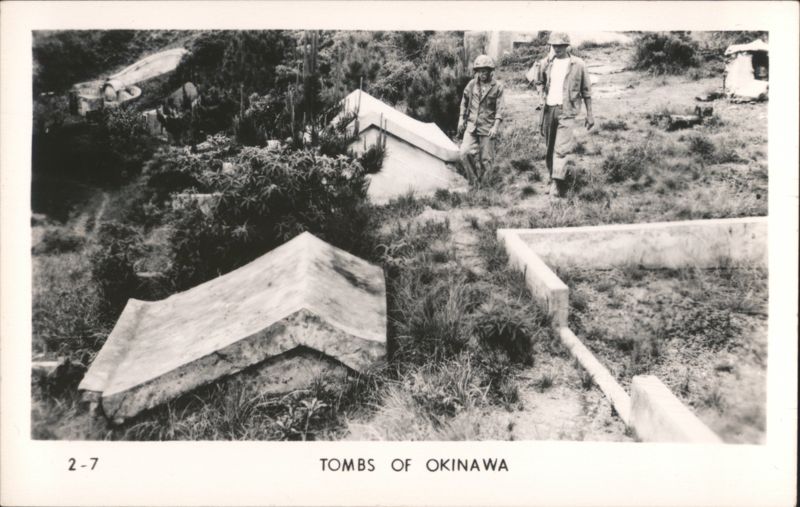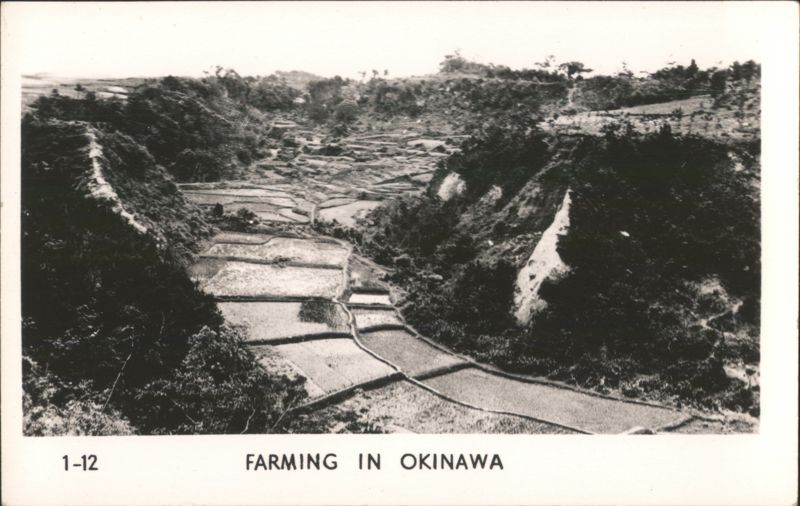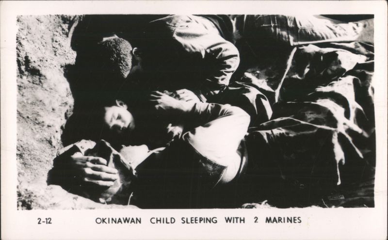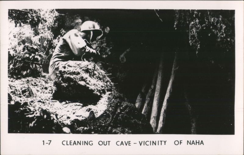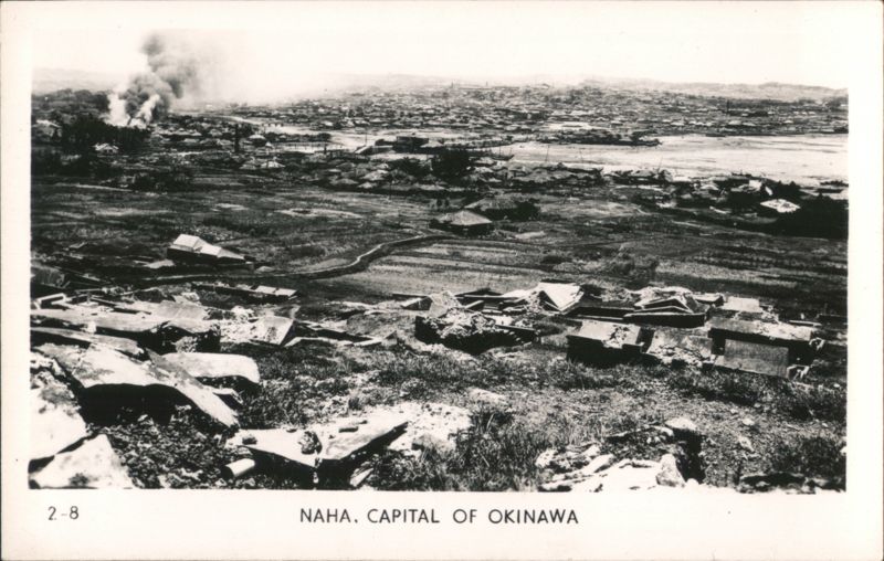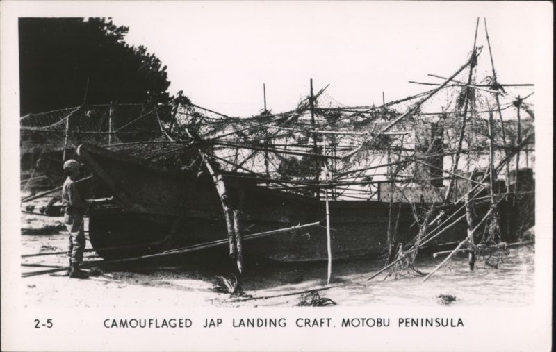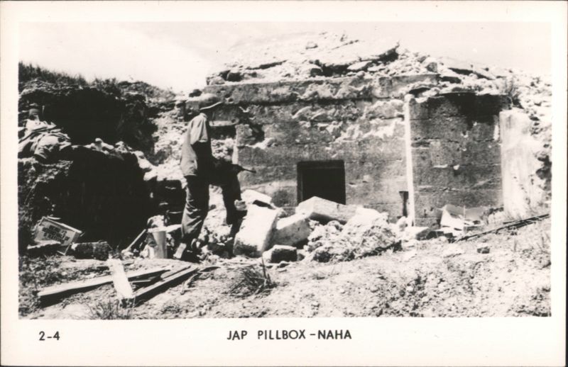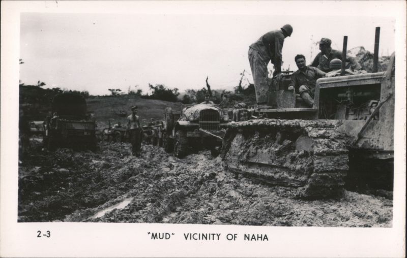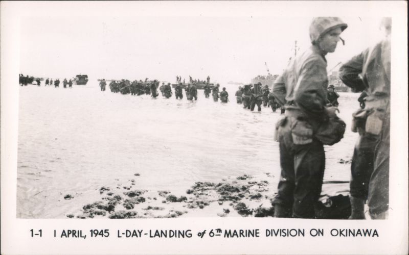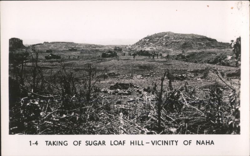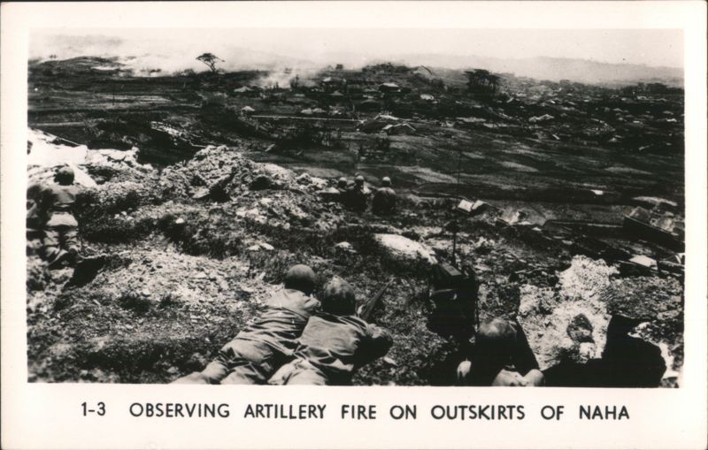MARINES MOVING THROUGH RICE PADDIES Military Vehicles in Mud, Naha Vicinity Jap Pillbox - Naha A man stands next to a damaged concrete pillbox structure. Camouflaged Japanese Landing Craft, Motobu Peninsula Church Services at Nago Tombs of Okinawa with Two Men Walking Naha, Capital of Okinawa - City View with Smoke Panoramic view of Naha showing extensive damage and smoke rising over the city, with rubble and damaged structures in the foreground. Soldiers Lined Up, One on Crutches, 'GOOD LUCK - GIVE 'EM HELL' Rice Paddies in Northern Okinawa Attack of Motobu Mountain, Motobu Peninsula Okinawan Child Sleeping with 2 Marines 1 April 1945 L-Day Landing 6th Marine Division Okinawa The General and The Private Observing Artillery Fire on Outskirts of Naha Taking of Sugar Loaf Hill – Vicinity of Naha Taking of Naha Chow Line Cleaning Out Cave - Vicinity of Naha Civilians Aid in Feeding Sick and Wounded Soldier in Silhouette, Watchful Waiting Tanks in Action Outskirts of Naha, Okinawa, Japan A military tank is shown on a barren, war-torn landscape, with a large explosion occurring nearby, creating a plume of smoke and debris. In the background, damaged structures and sparse vegetation are visible under a clear sky. Motobu Peninsula Landscape, On Road to Nago Farming in Okinawa, Terraced Fields A wide view of terraced agricultural fields winding through a valley, surrounded by lush hills and trees. |