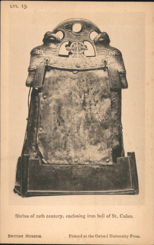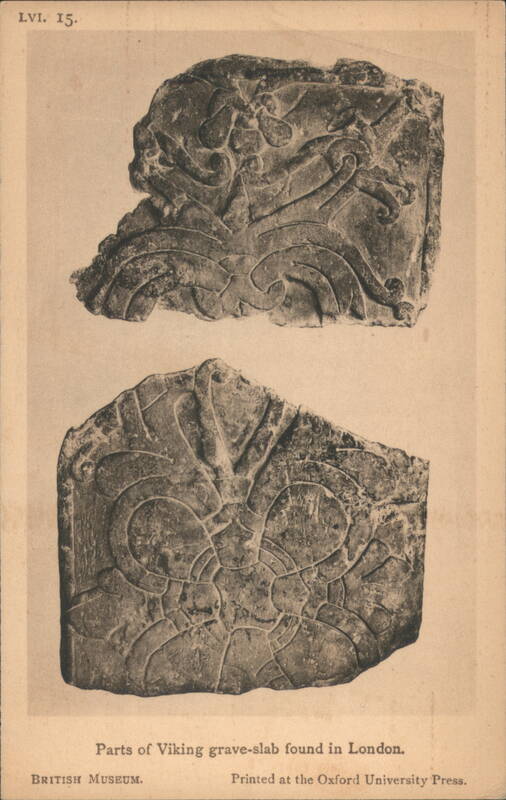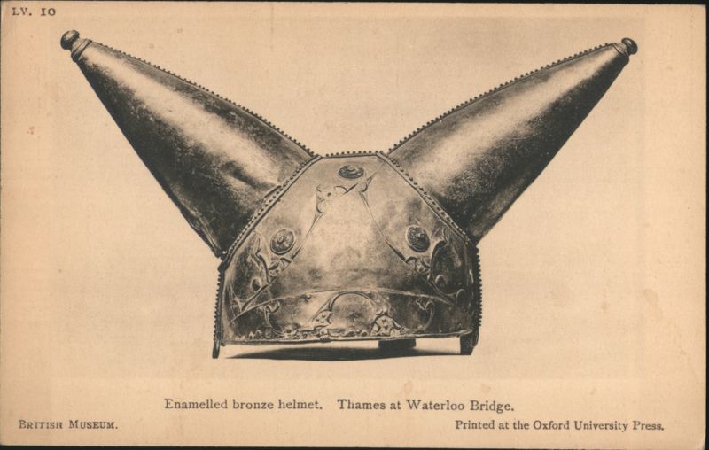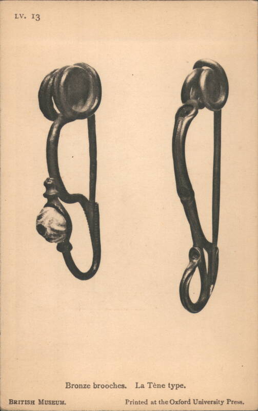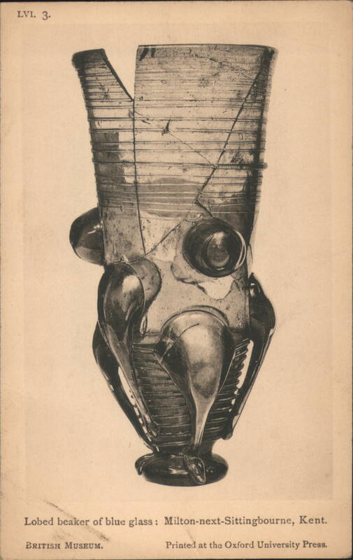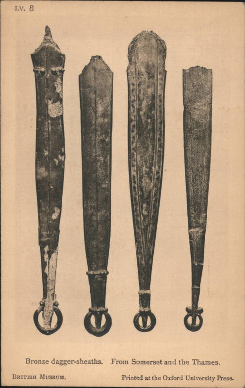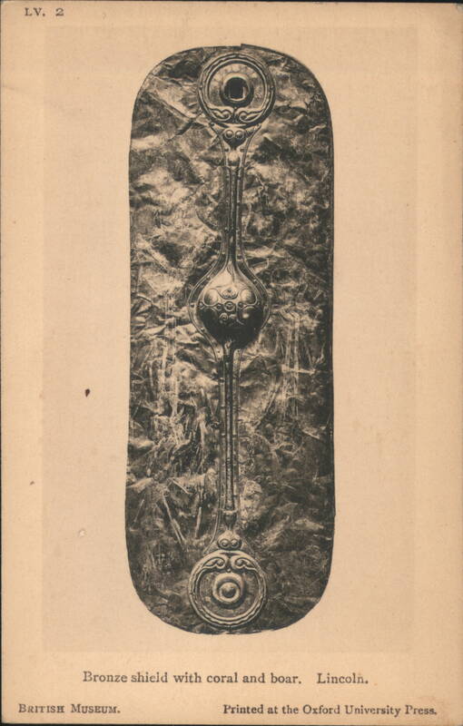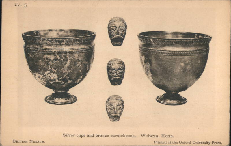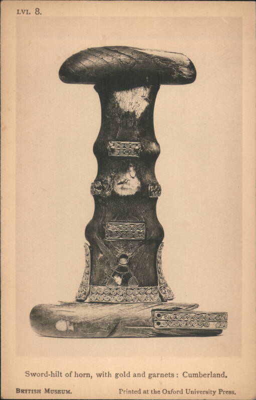 Iron Framework and Fire-Dogs from British Museum Lobed Beaker of Blue Glass, British Museum Collection Ancient artifact found in Milton-next-Sittingbourne, Kent. Bronze Dagger-Sheaths from Somerset and the Thames Four ancient bronze dagger-sheaths, archaeological artifacts from the British Museum. Iron Dagger with Bronze Handle and Sheath Bronze Shield with Coral and Boar Enamelled Bronze Helmet, Thames at Waterloo Bridge A detailed view of an ancient enamelled bronze helmet, featuring two prominent conical horns and intricate decorative patterns, discovered in the Thames. Silver Cups and Bronze Escutcheons from Welwyn Ornate silver cups displayed with three bronze escutcheons featuring human faces, identified as artifacts from Welwyn, Herts. Bronze Brooches, La Tène Type The image shows two ancient bronze brooches. The one on the left features a more elaborate design with a spherical element, while the one on the right is simpler in form. Sword-hilt of horn, with gold and garnets A detailed depiction of an ancient sword hilt, crafted from horn and adorned with intricate gold and garnet embellishments. The hilt has a distinctive, undulating shape with multiple segments featuring decorative patterns and what appear to be small figures or symbols. The artifact is from Cumberland and is part of the British Museum collection. Typical Anglo-Saxon Iron Weapons Franks Casket Front Panel with Runes Silver Chalice of King Alfred's Reign A silver chalice attributed to the reign of King Alfred, originating from Cornwall. 12th Century Shrine Enclosing Iron Bell of St. Culan Parts of Viking grave-slab Anglo-Saxon and Irish Art, Later Iron Age, with Leading Dates Details of cinerary urns, iron weapons, a sapphire-blue glass beaker, and ornamented buckles from the Anglo-Saxon and Irish Later Iron Age. Includes a list of leading historical dates from 410 A.D. to 1066 A.D. British Museum Anglo-Saxon and Irish Art Set Cover Illustration of the British Museum building on the cover for a set of 15 pictorial postcards featuring Anglo-Saxon and Irish art. |