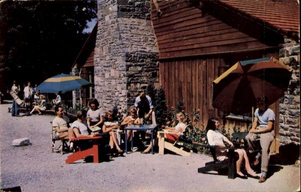 | Intermission in the sunshine outside the Central Club at Vacation Valley Resort on Echo Lake, Penna. "Young Idea in Summer Fun" features: 3,000 yard private Golf Course, Stables, Championship Tennis Courts, 40-acre natural Lake and Beach. Free late sleepers' Coffee Bar, plus "Best Band in the Poconos." |