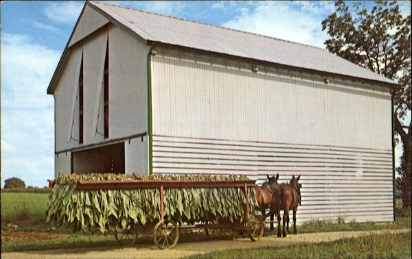 tobacco and pulled by a team of mules is shown