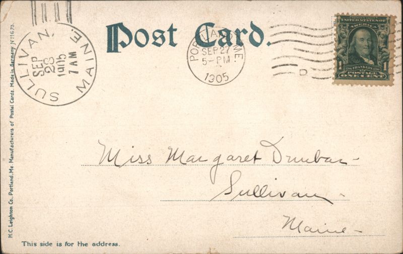 Features a Portland, ME machine cancel and a Sullivan, ME receiving postmark dated Sep 28, 1905.