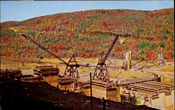 Popularly known as Kinzua Dam. Down View Overlook Northwesterly of the Cranes, Buckets, Cars, Cement Abutments. Route 59 - 8 miles East of Warren. Pa.