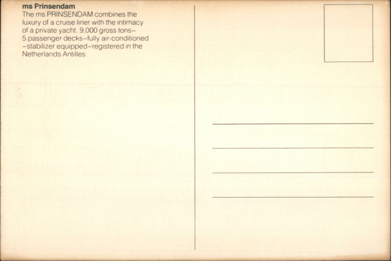 The MS Prinsendam cruise ship at sea. This 9,000 gross ton vessel features five passenger decks and luxury accommodations.