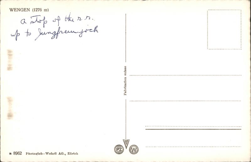 A scene at the Wengen railway station featuring trains, passengers with skis, and snow-covered mountains in the background.