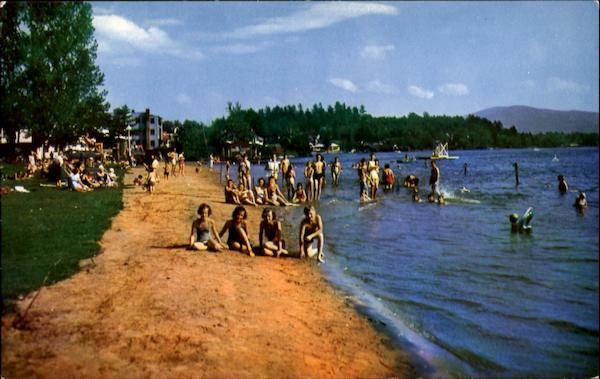 Saranac Lake Municipal Bathing Beach as seen from Village Park looking out onto Lake Flower, Saranac Lake, New York.
