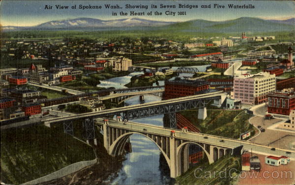 | Spokane is the headquarters for large-scale agricultural operations, extensive lumbering activity and is the mining capital of the Pacific Northwest. This is an excellent view of its seven bridges and five waterfalls which are located in the heart of the city. |