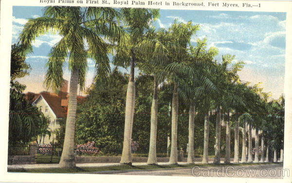 Front: Royal Palms on First St., Royal Palm Hotel in Background, Fort Myers, Fla.-1 Back: 26540N CO Yoon E. O. KROPP CO., MILWAUKEE