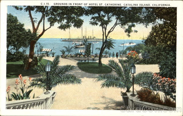 Front: C.I.15. GROUNDS IN FRONT OF HOTEL ST. CATHERINE, CATALINA ISLAND, CALIFORNIA. Back: 10 A.91797 AND ISLAND POSSESSIONS, CUBA, CANADA AND MEXICO WESTERN PUBLISHING & NOVELTY CO., LOS ANGELES, CAL.