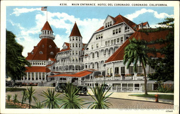 Front: 4336. MAIN ENTRANCE, HOTEL DEL CORONADO, CORONADO, CALIFORNIA. 117497 Back: WESTERN PUBLISHING & NOVELTY CO., LOS ANGELES, CALIF.