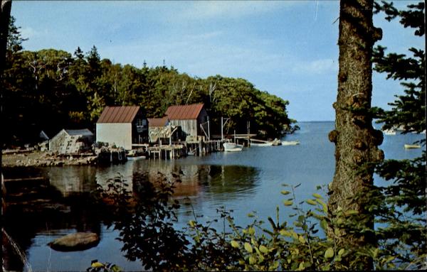 NEW HARBOR, MAINE Fish houses on BACK COVE, favorite scene for artists and photographers. Color by Lyman Owen The Maine Scene - Damariscotta 04543 1741 132011 Address