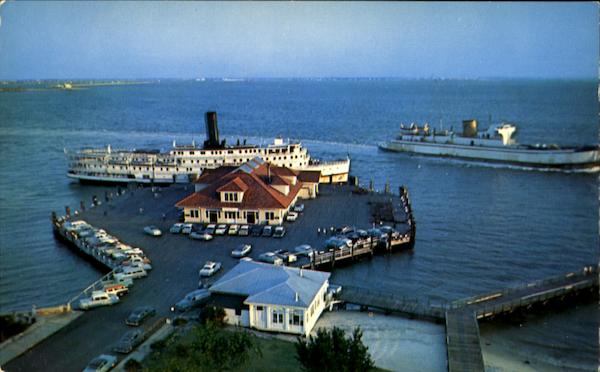 | Old Point Comfort Wharf from roof of Hotel Chamberlin, Fort Monroe, Virginia. The Old Bay Line steamer City of Norfolk is at the wharf. Beyond is the motor ship Northampton coming in from Kipitopeke. The wharf was originally built in 1862 for the landing of the Army of the Potomac when General McClellan tried to capture Richmond by advancing up the Virginia Peninsula. |