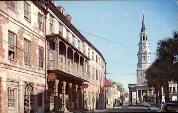 | The Dock St. Theater, on left, opened in 1736, is the first building in America designed solely for theatrical purposes and is still in use today. St. Philip's Episcopal Church in background, erected 1835, is one of the most famous landmarks of the city. |