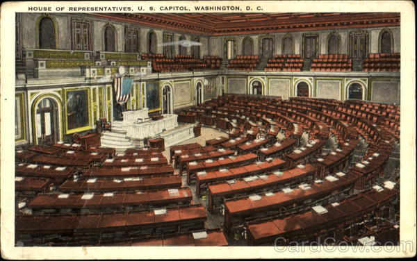 In the southern wing of the U. S. Capitol is the U. S. House of Representatives. The Ham of the House occupies the main floor. It is 139 ft. in length, 93 ft. wide and 30 ft high. The members desks are of mahogany, the Speaker's desk of white marble, elevated below which are the desks of the clerks and official reporters of the House. The visitors' galleries are entered from the floor above. A ceiling of glass panels having the Coat of Arms of each state painted upon them diffuses a soft light throughout the chamber. |