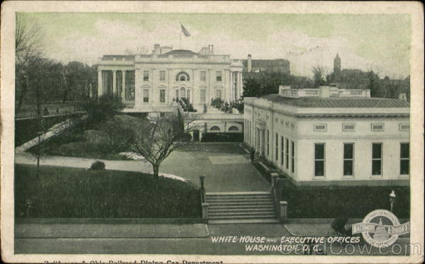 Front: ALLTRAINS BALTIMORE WHITE HOUSE AND EXECUTIVE OFFICES Dailmand Dining Ce Danentment WASHINGTON, D. C. WITH STOP VIA OVERW WASHINGTO &OHIOR PRIVILEGE Back: 1 CENT. 2 CENTS. CORRESPONDENCE HERE. NAME AND ADDRESS HERE.