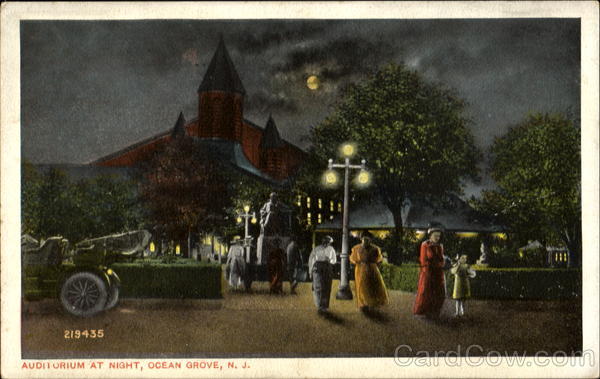 Front: 219435 AUDITORIUM AT NIGHT, OCEAN GROVE, N. J. Back: PUB. BY THE POST CARD DISTRIBUTING CO.. PHILADELPHIA. PA. THIS SPACE MAY BE USED FOR MESSAGE FOREIGN- TWO CENTS.