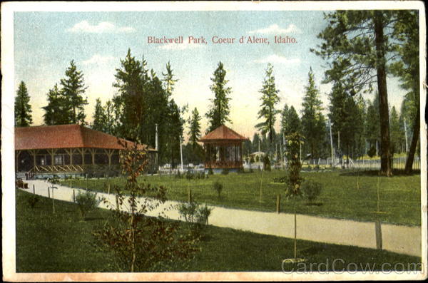 Front: Blackwell Park, Coeur d'Alene, Idaho. Back: 76889 ON M. Rieder, Publ., Los Angeles, Cal. Made in Germany. Blackwell Park consists of 20 acres located directly on the Lake front and adjacent to the Electric Terminal.