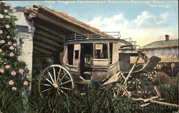 Front: First Stage in California at Ramona's Marriage Place, San Diego. 335 Back: POSSESSIONS 1¢ 24 ** PUBLISHED BY EDWARD H. MITCHELL, SAN FRANCISCO✶ ✶