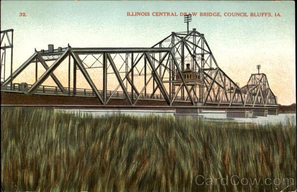 Front: 32. ILLINOIS CENTRAL DRAW BRIDGE, COUNCIL BLUFFS, IA. Back: PUBLISHED BY WIN CHICAGO, U.S.A. Post Gard FOR ADDRESS ONLY
