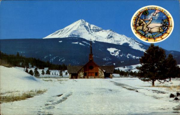 At Big Sky of Montana. Lone Mountain in background. The Stained Glass Window On the front of the Soldier's Chapel