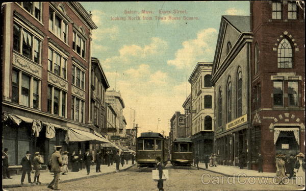 From Town House Square the visitor may turn down Essex street. On the northeast corner of the Square stood until 1792 a tavern kept by Widow Margaret Pratt, a famous many gabled hostelry. Built on land originally owned by the regicide, Rev, Hugh Peter. Just beyond, at 218 Essex Street, was the homestead of "Father John Woodbury," one of the Old Planters. |