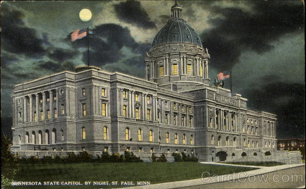 Front: MINNESOTA STATE CAPITOL, BY NIGHT, ST. PAUL, MINN. Back: BLOOM BROS. CO., MINNEAPOLIS, MINN. BROS SCENIC and Island Possessions Cuba, Canada and For Foreign. R-45957 ADDRESS HERE