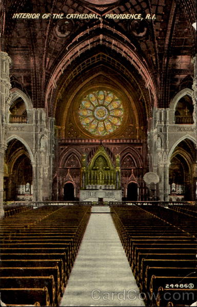 Front: INTERIOR OF THE CATHEDRAL, PROVIDENCE, R.. 244860 Back: 57- I sulhope this church will be facked Christmas Maning PROD NOVIS 7 30 AM 1910 Mrs James Mc Park Westerly 1.96 Main Street R.d This side for the Address only