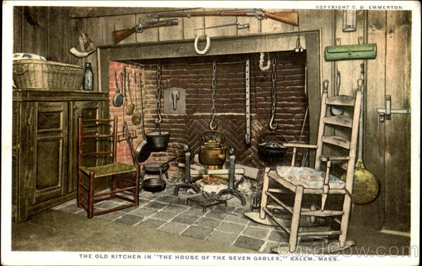 Front: COPYRIGHT C. O EMMERTON THE OLD KITCHEN IN THE HOUSE OF THE SEVEN GABLES," SALEM, MASS. Back: "PHOSTINT" TRADE MARK HEG US PAT CFF MADE ONLY BY DETROIT PUBLISHING CO. 3- THIS SPACE MAY BE USED FOR MESSAGE. XXI THIS SPACE FOR THE ADDRESS