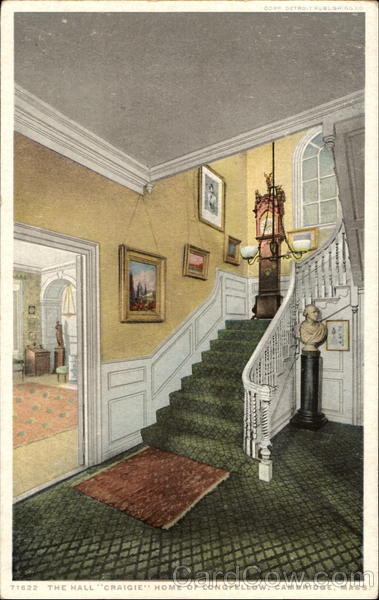 Front: COPR. DETROIT PUBLISHING CO. 71622 THE HALL "CRAIGIE HOME OF LONGFELLOW, CAMBRIDGE, MASS. Back: "PHOSTINT" REG US PAT OFF MADE ONLY BY DETROIT PUBLISHING CO THIS SPACE MAY BE USED FOR MESSAGE. FOREIGN. TWO CENTS