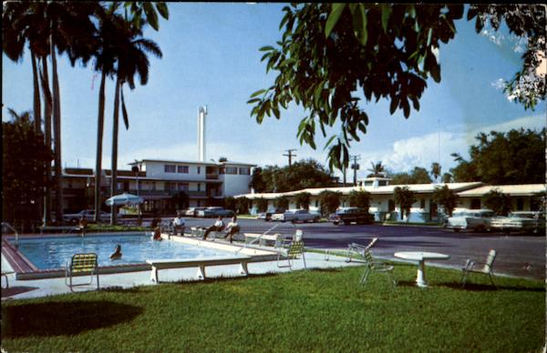 On the Beautiful Caloosahatchee river Route 41, Downtown Fort Myers, Florida. Luxurious living amid tropical palms, superbly furnished penthouses, efficiencies, overnight rooms, each with tub and shower, telephone, steam heat, individually air conditioned, outdoor, indoor lounges, fresh water swimming pool, barbecue pit. |