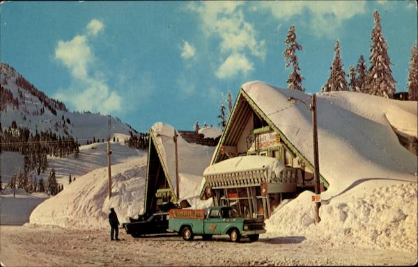 | A winter sun casts its golden glow on Summit In - the concession center providing food and comfort to the thousands of skiers who frequent this popular winter sports area. U. S. Highway No. 2 makes the region accessible from both eastern and western Washington |