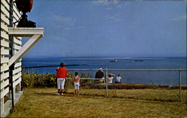 MOUTH OF COLUMBIA RIVER Ships from world ports enter the Columbia River on their way to inland berths. This area famous for fall salmon fishing. This view from Cape Dis- appointment Lighthouse. Distr. by: PHOTO'NEIL, Long Beach, Washington 39684 ك