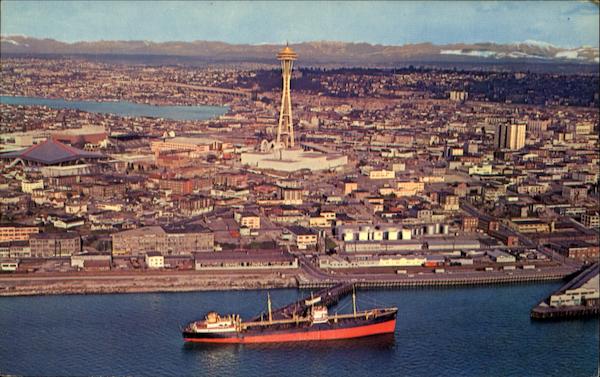 The magnificent Space Needle dominates this spectacular aerial view of the "World's fair City," showing Lake Union in left background, a section of the waterfront, and the snow covered cascades in the distance.