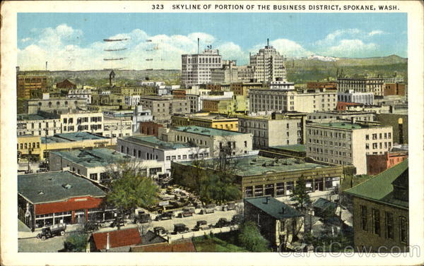 Front: 323 SKYLINE OF PORTION OF THE BUSINESS DISTRICT, SPOKANE, WASH. Back: 504 6233-29 greeting OSTAS 6 MAR 16 in! DHIS SPACE FOR ADDRESS OND 830 PM 1936 WAS ROBBINS.TILLQUIST CO. SPOKANE, WASH. Hapkinhão Smars. to miss trenshall.