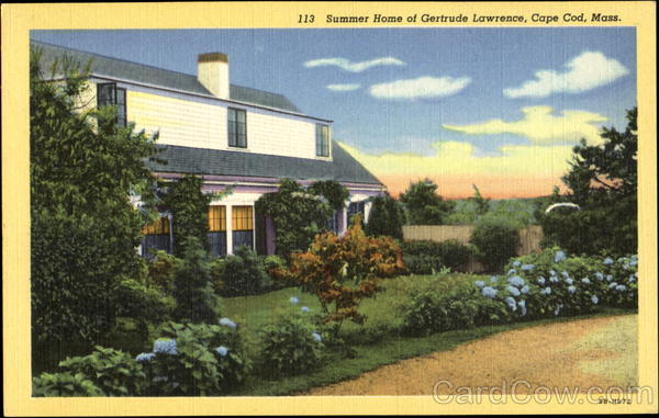 Front: 113 Summer Home of Gertrude Lawrence, Cape Cod, Mass. 5B-H872 Back: DISTRIBUTED BY E. D. WEST CO SOUTH YARMOUTH, CAPE COD "ASS. Located in East Dennis just off Route 6.