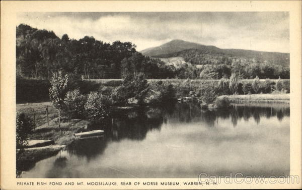 Front: PRIVATE FISH POND AND MT. MOOSILAUKE, REAR OF MORSE MUSEUM, WARREN, N. H. Back: "THE CITY" POST CARDS PUBLISHED BY THE MAYNARD WORKSHOP, WABAN, MASS