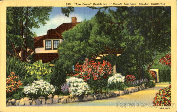 Front: 880 "The Farm" Residence of Carole Lombard, Bel-Air, California 8A-H2985 Back: WESTERN PUBLISHING & NOVELTY CO., LOS ANGELES, CALIF. "C.T. ART-COLORTONEā REG.U.S. PAT. OFF.
