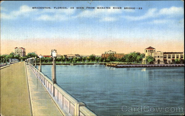 Approaching Bradenton from the north, crossing the Green Bridge, coasting $1,250,000, you see the large public buildings, hotels, banks, etc. towering in the distance. At the right is Memorial Pier, the Chamber of Commerce, Tourist Auditorium Building, and Yacht Basin. |