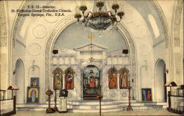 | The Greek people are intensely devout and much of the wealth they have taken from the sea in sponges goes into their church and its adornment. Tons of choice Grecian marble have been used to add the beauty of the interior of this church, adorned with exquisite chandeliers and with the bishop's throne mode of solid marble. |