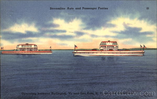 Front: Streamline Auto and Passenger Ferries 23 Operating between Burlington, Vt. and Port Kent N. Y on Lake Champlain Back: He Romißangt GTON 2. Only ferry of do Will see you 405 So 270 soon It of Sorris my sem