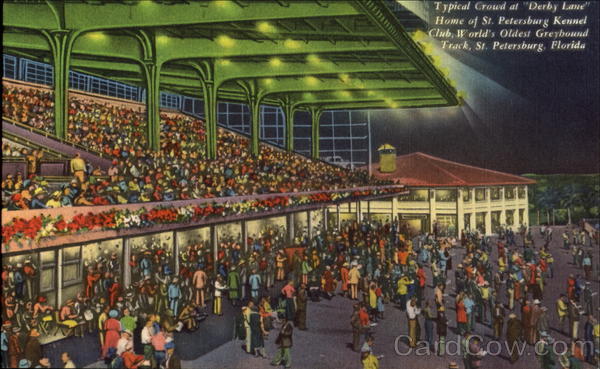 Typical Crowd at "Derby lane" Home of St. Petersburg Kennel Club, World's oldest Greyhound Track, St. Petersburg, Florida. "Derby Lane" home of the St. Petersburg Kennel Club is recognized as the world's oldest Greyhound Track. Racing introduced Jan. 3, 1925. Track derives Derby lane name from St. Petersburg Derby, oldest blue ribbon classic in Greyhound Racing Sport. |