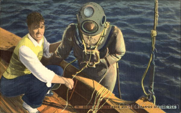 Front: T1 DIVER ASCENDING FROM SEA FLOOR, TARPON SPRINGS, FLA. Back: E-4365 sof I ㅍ sh-amof Published by Hartman Card Co. Pinellas Park, Horida