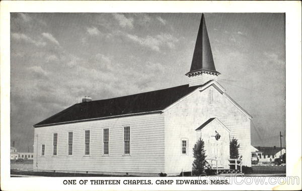 Front: ONE OF THIRTEEN CHAPELS, CAMP EDWARDS, MASS. Back: he NAME RANK UNITED STATES ARMY THE HAMENT PUBLISHING CO., BROOKLYN, N. Y.