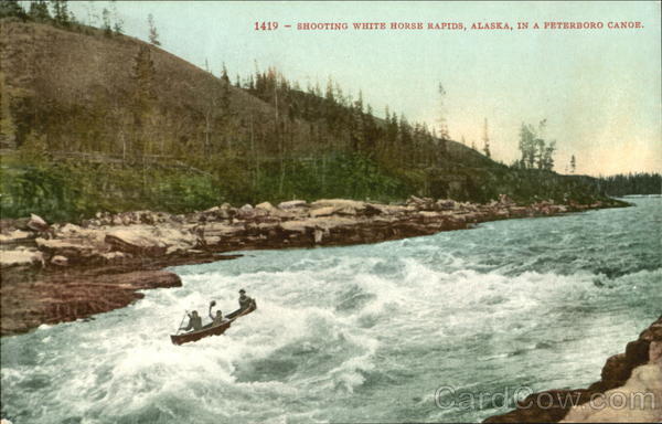 Front: 1419 SHOOTING WHITE HORSE RAPIDS, ALASKA, IN A PETERBORO CANOE. Back: Post Card- THIS SPACE EDWARD H. MITCHELL. PUBLISHER, SAN FRANCISCO.