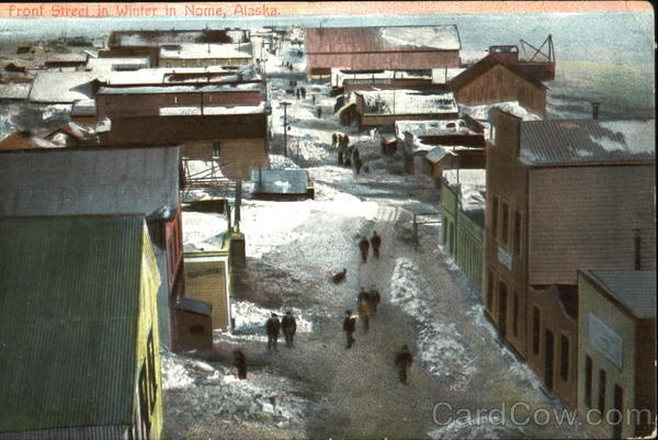 Front: Front Street in Winter in Nome, Alaska. TEAMSHIP OFFICE Back: No. 9025. Publ. by Portland Post Card Co., Portland, Ore. and Seattle, Wash. (Made in Germany.) Write here. 1 c Cuba 2 ° 00