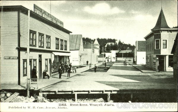 Front: POST OFFICE GENERAL MERCHANDISE FURS FORLAG F.MATHESON STATIONERY POST CARDS DRUGST 11812. Street Scene, Wrangell. Alaska. Published by W. H. Case, Juneau, Alaska. Back: ENN THIS SPACE CAN BE USED FOR A WRITTEN MESSAGE, USING ONE-CENT STAMP